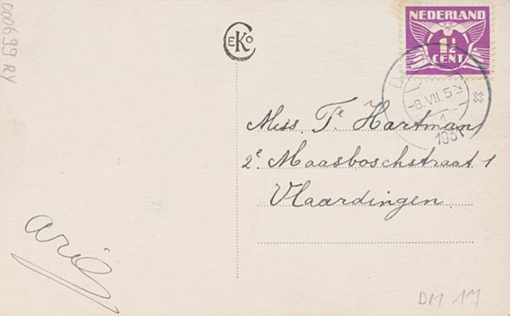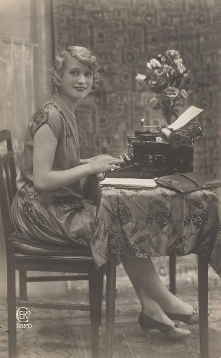 Illustrierte Postkarte; Fotografie, monochrom; Serie Ceko 1820 Rückseite: Frau mit Schreibmaschine, Blumen als Dekoration Vorderseite: beschrieben, adressiert; Briefmarke Nederland 1 1/2 Cent; Poststempel Dieren/8 VII 1931