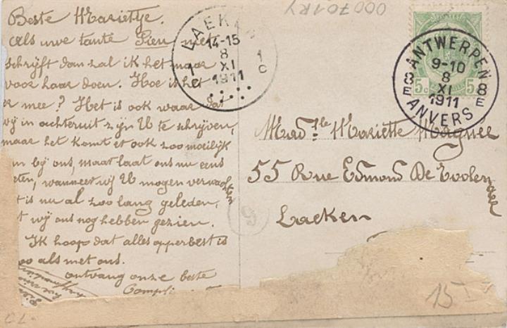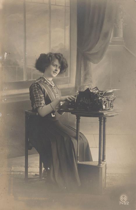 Illustrierte Postkarte; Fotografie, monochrom; Serie LL 749/2 Rückseite: Frau mit Schreibmaschine Vorderseite: beschrieben; adressiert an M.lle Magriée, Laeken; Briefmarke Postes Belgique 5c; Poststempel Antwerpen/8 XI 1911