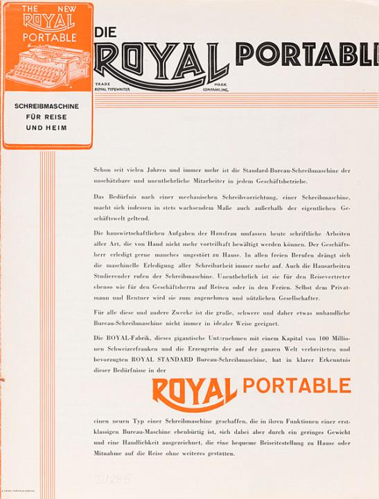 Faltprospekt für Schreibmaschine Royal Portable