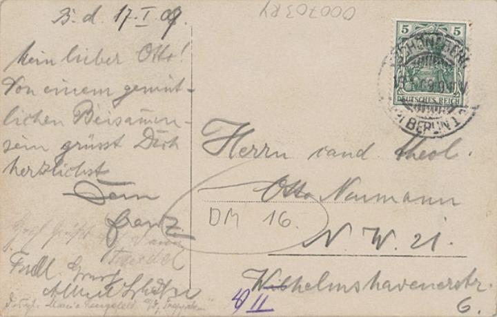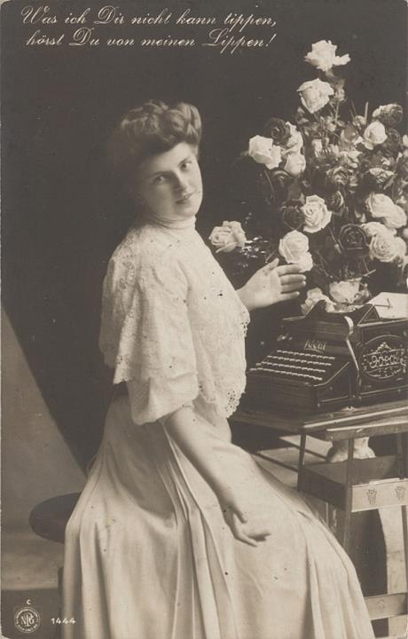 Illustrierte Postkarte; Fotografie, monochrom; Serie NPG 1444 Rückseite: Frau mit Schreibmaschine, Blick zum Betrachter, Blumen als Dekoration Vorderseite: beschrieben, adressiert; Briefmarke Deutsches Reich 5 Pf., Poststempel Schöneberg/13.1.1909
