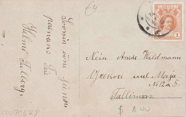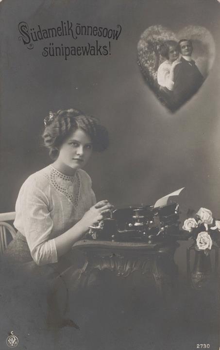 Illustrierte Postkarte (Geburtstag); Fotografie, monochrom; Serie NPG 2730 Rückseite: Frau mit Schreibmaschine, rechte obere Ecke mit Bild eines Paares (Herzform) Vorderseite: beschrieben; adressiert an Neiu Waldmann, Tallinnas; Briefmarke Estland(?) 1 Kop.; Poststempel 15.2.1913