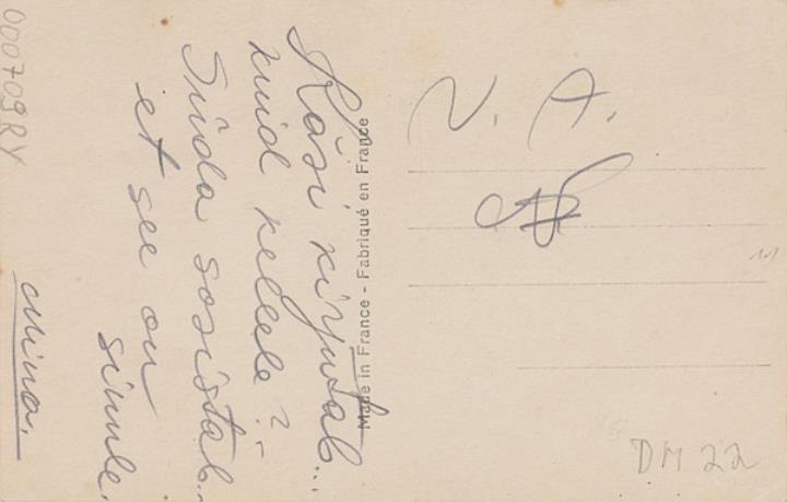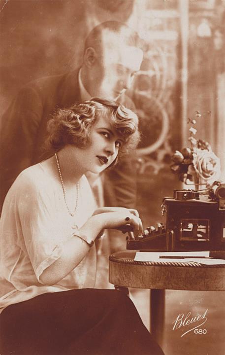 Illustrierte Postkarte; Fotomontage, monochrom; Serie Bleuet 680 Rückseite: Frau mit Schreibmaschine, im Hintergrund Mann als Erscheinung/Traumbild Vorderseite beschrieben