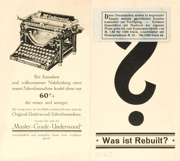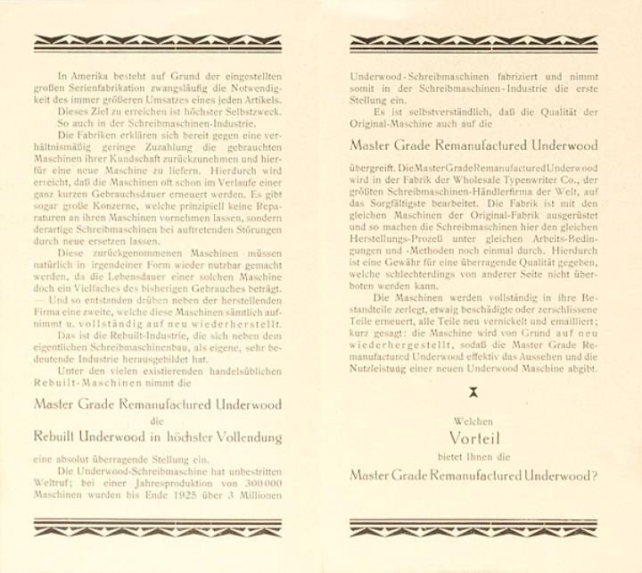 Faltprospekt für Rebuilt-Maschinen Underwood aus wiederverwendeten Original-Bestandteilen