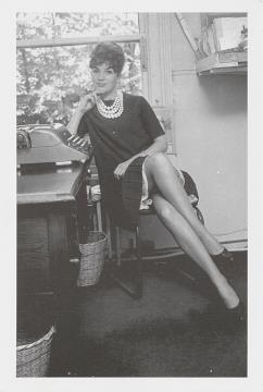 Illustrierte Postkarte; Nachdruck einer Fotografie von um 1960, monochrom Rückseite: Sekretärin in modischer Kleidung mit Schreibmaschine, Blick zum Betrachter Vorderseite nicht beschrieben