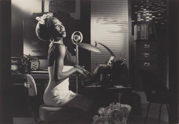 Werbepostkarte; Fotografie, monochrom; Nr. P-190 Rückseite: singende Sekretärin mit Schreibmaschine Vorderseite nicht beschrieben