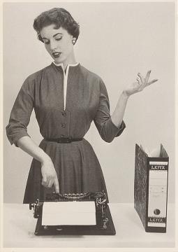 Illustrierte Postkarte; Nachdruck einer Fotografie von 1953, monochrom Serie 101/2 Deutsche Modefotografie der 50er Jahre (Foto: Norbert Leonard) Rückseite: Sekretärin mit Schreibmaschine und Ringordner Leitz Vorderseite nicht beschrieben