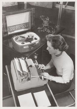 Illustrierte Postkarte; Nachdruck einer historischen Fotografie, monochrom; Serie Tushita Nr. MB 11 Rückseite: Sekretärin mit Schreibmaschine, tragbarem Tonbandgerät und Röhrenradio Vorderseite nicht beschrieben