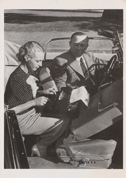 Illustrierte Postkarte; Nachdruck einer historischen Fotografie, monochrom; Serie Tushita Nr. MB 93 Rückseite: Autoszene; Vorgesetzter und Sekretärin mit Schreibmaschine beim Diktat Vorderseite nicht beschrieben