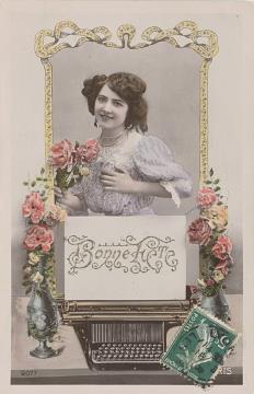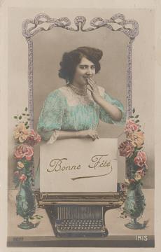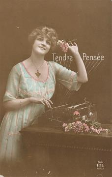 Illustrierte Postkarte; Fotografie, koloriert; Serie ER Paris 165 Rückseite: Frau mit Blumen und Schreibmaschine Vorderseite: beschrieben; adressiert an M.elle Lambert, Charleroi; Briefmarke Postes Belgique 5c; Poststempel Charleroi/30 X 1919