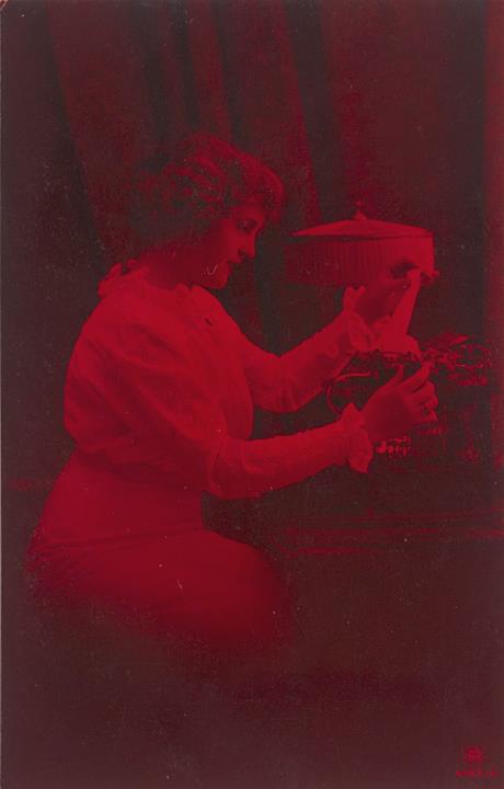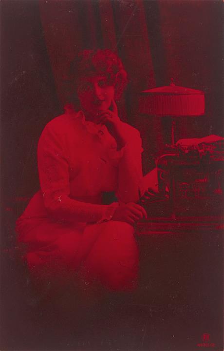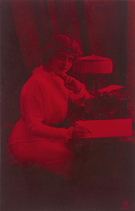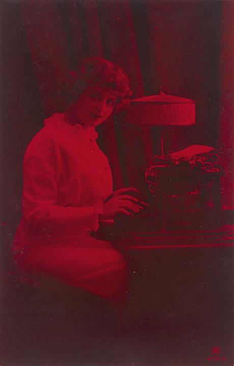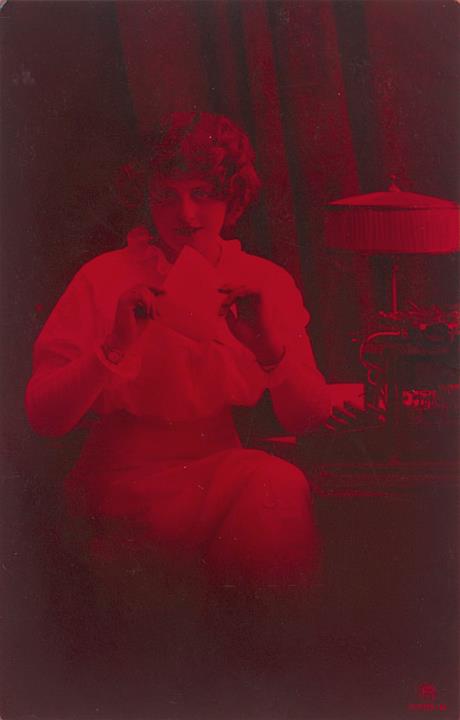 Konvolut aus fünf Postkarten; Fotografie, getönt; Serie RPH 4133/2-6 Rückseite: Frau mit Schreibmaschine, Tischlampe als Dekoration Vorderseite beschrieben
