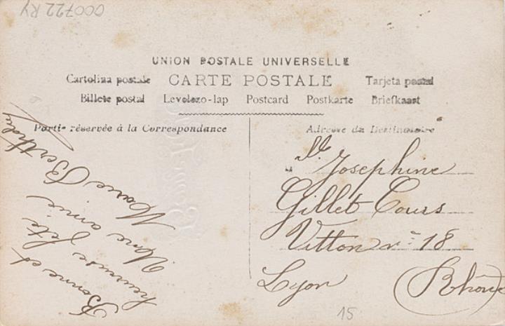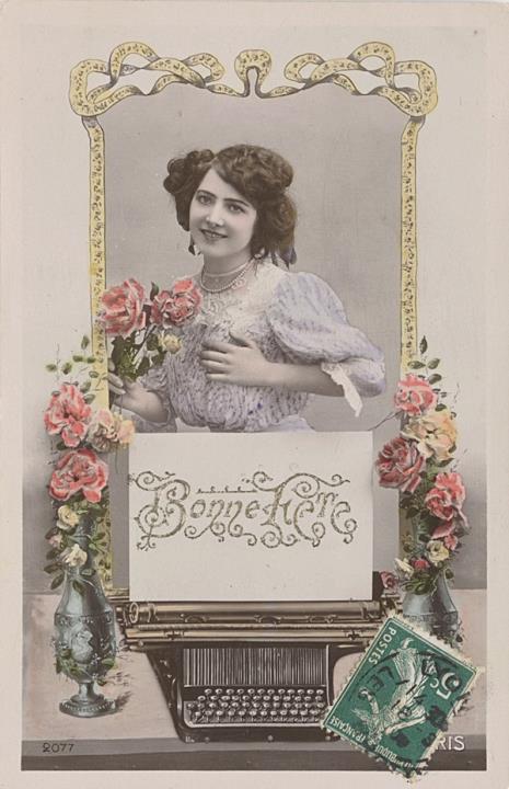 Illustrierte Postkarte; Fotocollage, koloriert; Serie Iris 2077 Rückseite: Frau mit Schreibmaschine, Blumen als Dekoration; Briefmarke Postes Francaises 5c; Poststempel Lyon Vorderseite beschrieben