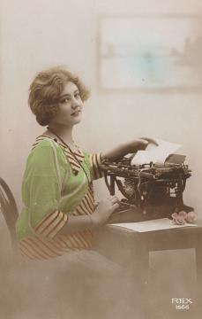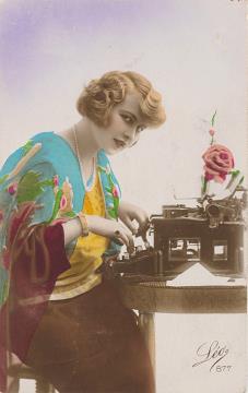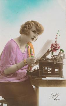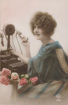 Illustrierte Postkarte; Fotografie, koloriert; Serie A. Noyer 3404 Rückseite: Frau mit Schreibmaschine und Telefon, Blick zum Betrachter Vorderseite: beschrieben und adressiert; Poststempel 3 X 1922