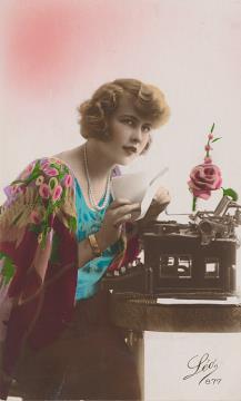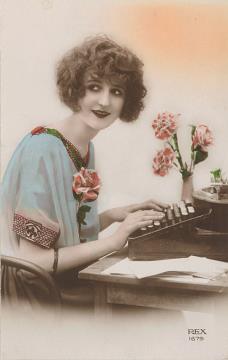 Illustrierte Postkarte; Fotografie, koloriert; Serie Rex 1679 Rückseite: Frau mit Schreibmaschine, Blumen als Dekoration Vorderseite beschrieben