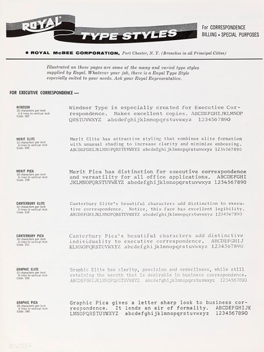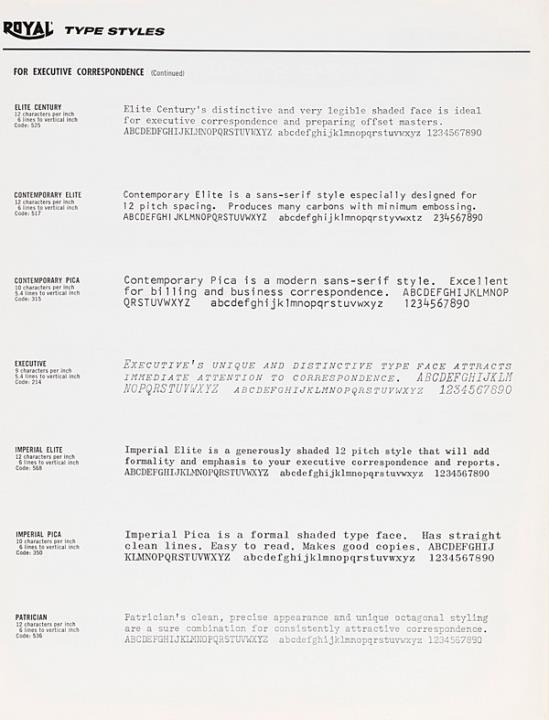 Schriftartenverzeichnis für Schreibmaschine Royal for correspondence. billing. special purposes Nr. 02B-60-338