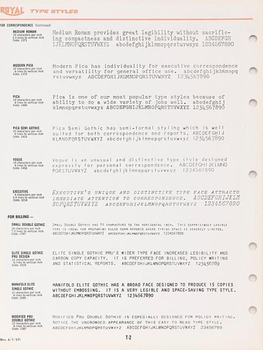 Schriftartenverzeichnis für Schreibmaschine Royal for correspondence. billing. special purposes Nr. Rev. 6/1/57