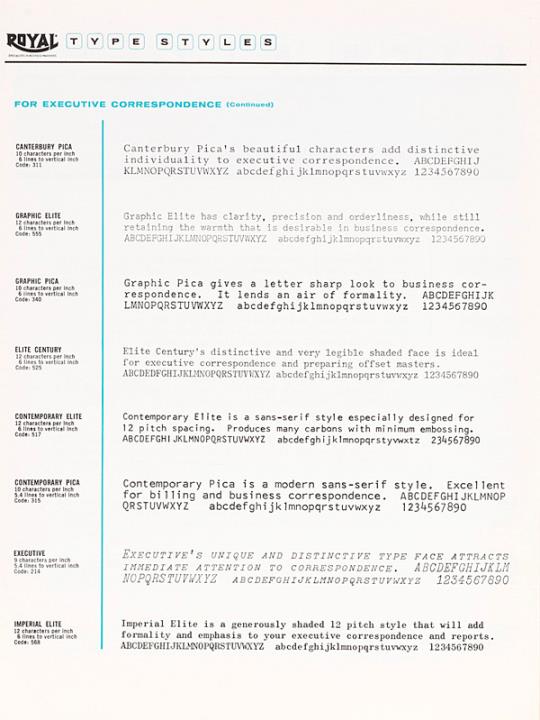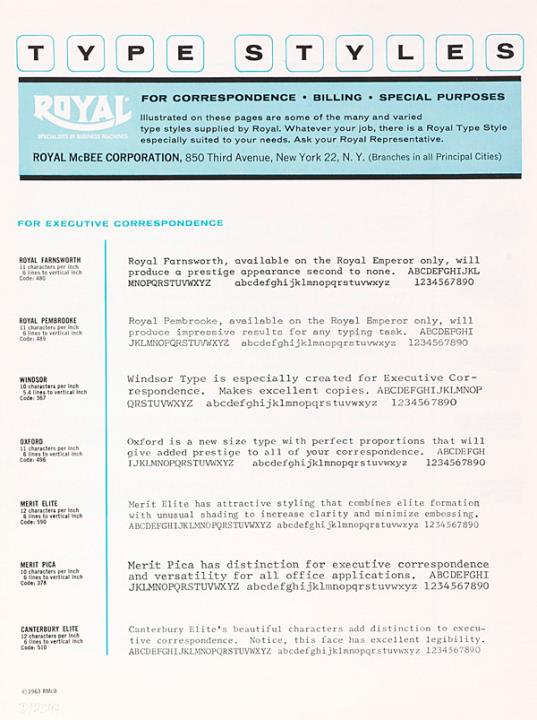 Schriftartenverzeichnis für Schreibmaschine Royal for correspondence. billing. special purposes Nr. EM 2B-63-282