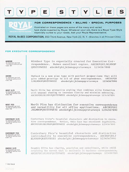 Schriftartenverzeichnis für Schreibmaschine Royal for correspondence. billing. special purposes Nr. EM 2B-62-268