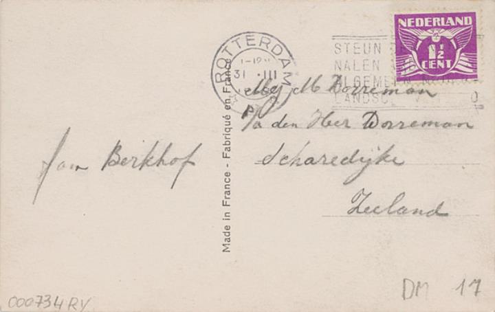 Illustrierte Postkarte; Fotografie, koloriert; Serie Leo 877 Rückseite: Frau mit Schreibmaschine, Blume als Dekoration Vorderseite: beschrieben, adressiert; Briefmarke Nederland 1 1/2 Cent; Poststempel Rotterdam/31 III 192x
