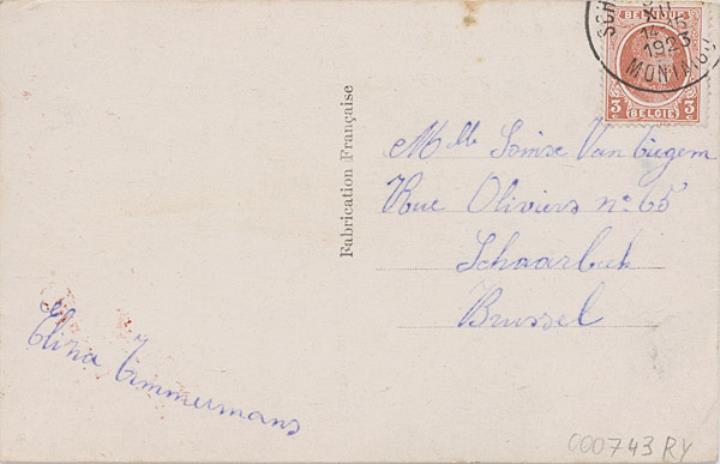 Illustrierte Postkarte; Fotografie, koloriert; Serie Ceko 916 Rückseite: Frau mit Schreibmaschine, Blick zum Betrachter Vorderseite: beschrieben; adressiert an M.elle Van Ciegem, Brüssel; Briefmarke Belgique 3c; Poststempel xx XII 1923