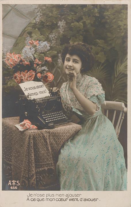 Illustrierte Postkarte; Fotografie, koloriert; Serie AS 656 Rückseite: junge Frau mit Schreibmaschine, Blick zum Betrachter, Blumen als Dekoration, darunter Text in Versform Vorderseite nicht beschrieben