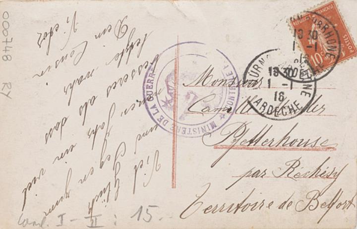 Illustrierte Postkarte; Fotografie, koloriert; Serie Unio 217 Rückseite: Frau mit Schreibmaschine, Blick zum Betrachter, Blumen als Dekoration; Poststempel Dannemarie/5 I 1916 Vorderseite: beschrieben; adressiert an Monsieur Muller, Pfetterhouse; Briefmarke Postes Francaises 10c