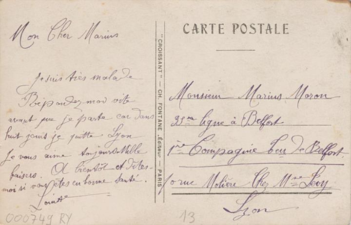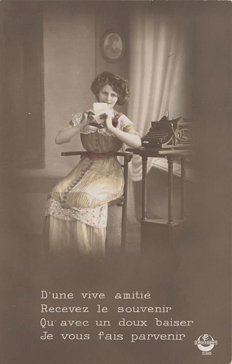 Illustrierte Postkarte; Fotografie, koloriert; Serie Croissant 280 Rückseite: Frau mit Brief und Schreibmaschine, Text in Versform Vorderseite: beschrieben; adressiert an Monsieur Maron, Lyon