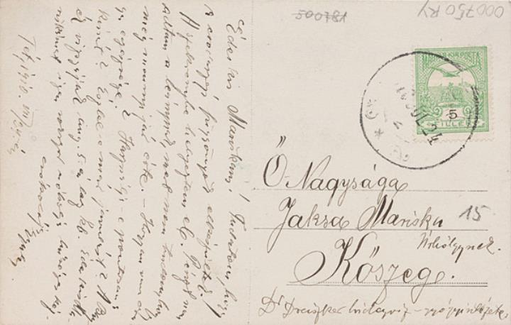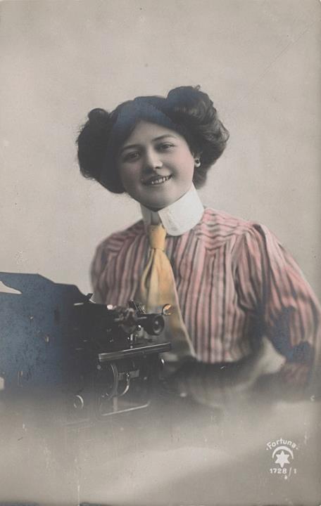 Illustrierte Postkarte; Fotografie, koloriert; Serie Fortuna 1728/1 Rückseite: Frau mit Schreibmaschine, Blick zum Betrachter Vorderseite: beschrieben und adressiert; Briefmarke Magyar Posta 5 Filler; Poststempel xx Jul 1924