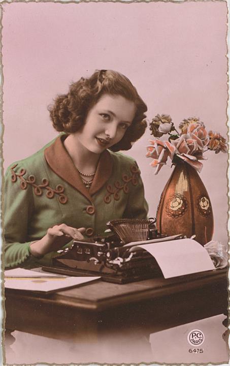Illustrierte Postkarte; Fotografie, koloriert, getönt; Serie PC 6475 Rückseite: Frau mit Schreibmaschine, Blick zum Betrachter, Blumen als Dekoration; Karte mit Goldrand Vorderseite nicht beschrieben
