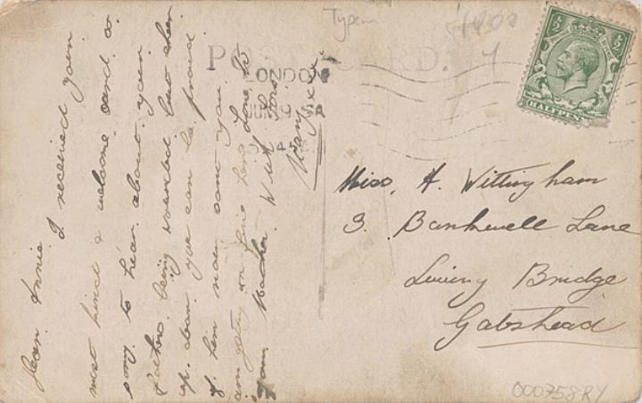 Illustrierte Postkarte; Fotografie, Grafik, polychrom Rückseite: Frau mit Schreibmaschine, Blick zum Betrachter, darüber Kind als Engel Vorderseite: beschrieben, adressiert; Briefmarke Postage Revenue (U.K.) Half Penny