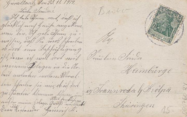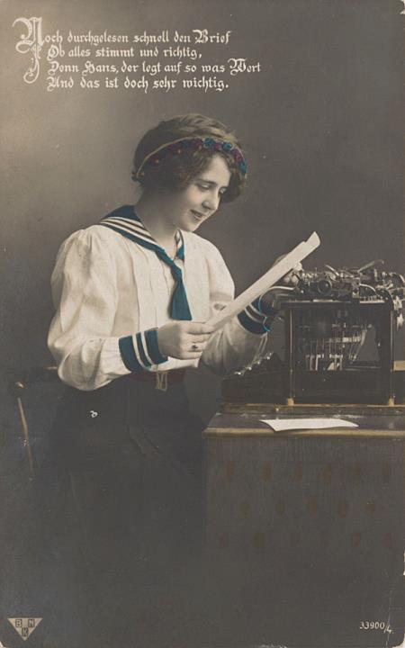 Illustrierte Postkarte; Fotografie, koloriert; Serie BNK 33900/4 Rückseite: Frau/Sekretärin mit Schreibmaschine, darüber Text in Versform Vorderseite: beschrieben, datiert 25.11.1914(?); adressiert an Fräulein Heimbürge, Trannroda; Briefmarke Deutsches Reich 5 Pf:; Poststempel unleserlich
