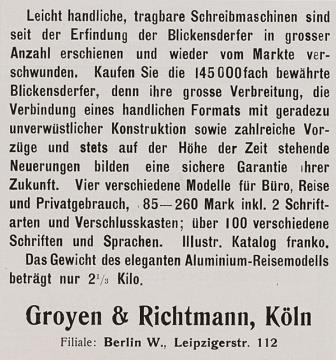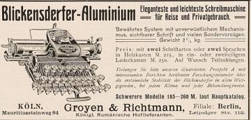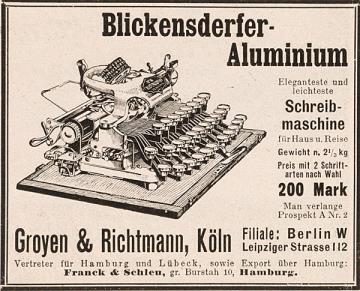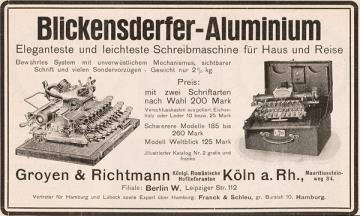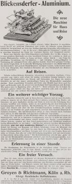 Werbeanzeige für Schreibmaschine Blickensderfer Aluminium Eleganteste und leichteste Schreibmaschine für Reise und Privatgebrauch monochrom