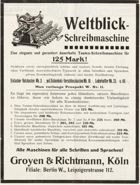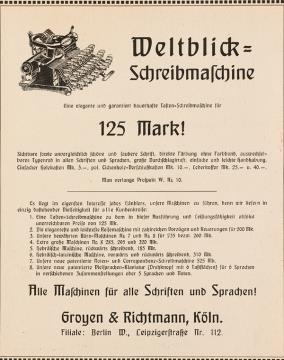 Werbeanzeige für Schreibmaschine Weltblick (Blickensderfer) monochrom