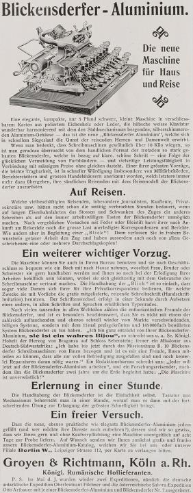 Werbeanzeige für Schreibmaschine Blickensderfer Aluminium monochrom