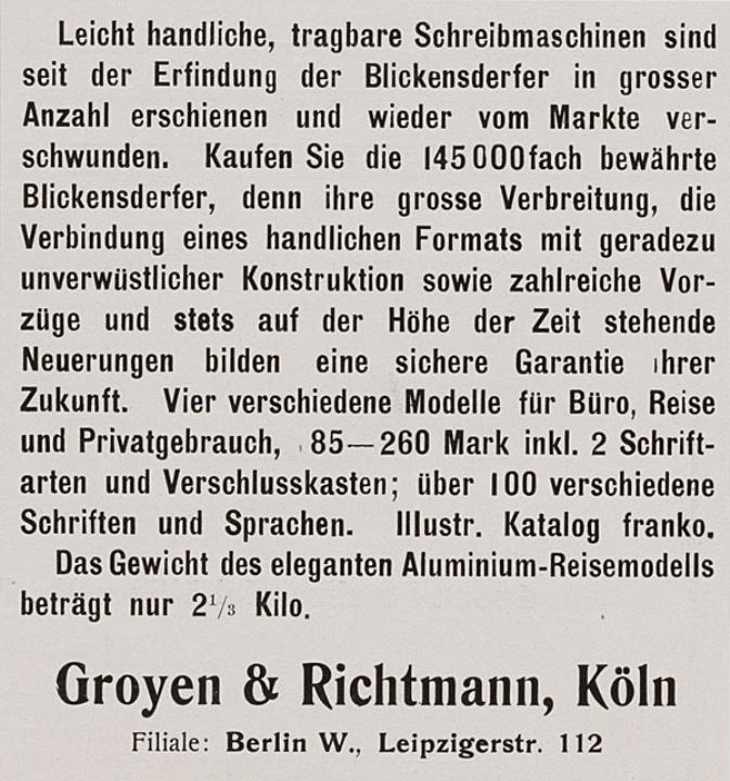 Werbeanzeige für Schreibmaschine Blickensderfer monochrom