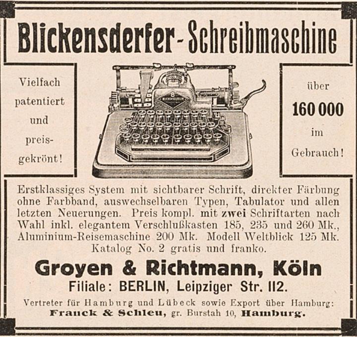 Werbeanzeige für Schreibmaschine Blickensderfer monochrom