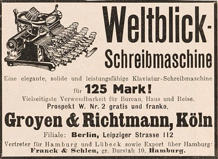 Werbeanzeige für Schreibmaschine Weltblick (Blickensderfer) monochrom