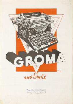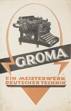 Faltprospekt für Schreibmaschine Groma N Die elegante, strapazierfähige Schreibmaschine für Beruf, Heim und Reise Nr. 100.2.38. Grafik: Elm