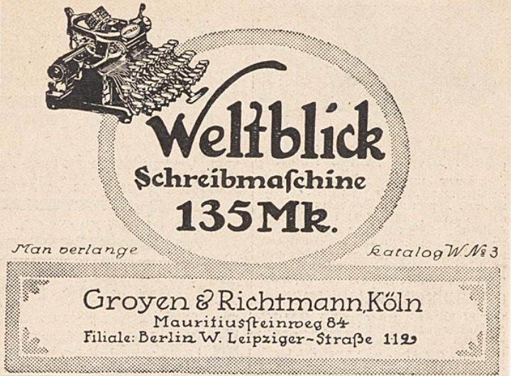Werbeanzeige für Schreibmaschine Weltblick (Blickensderfer) monochrom