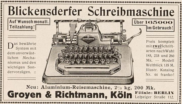 Werbeanzeige für Schreibmaschine Blickensderfer monochrom
