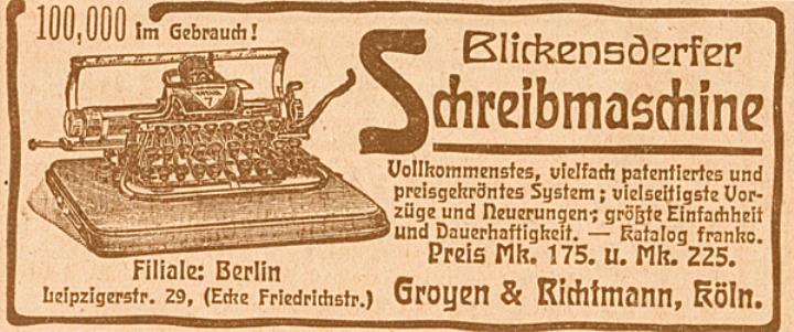 Werbeanzeige für Schreibmaschine Blickensderfer monochrom