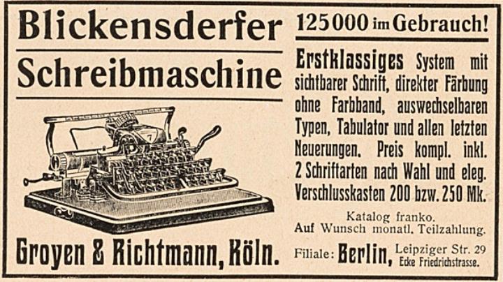 Werbeanzeige für Schreibmaschine Blickensderfer monochrom