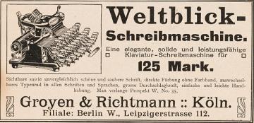 Werbeanzeige für Schreibmaschine Weltblick (Blickensderfer) monochrom