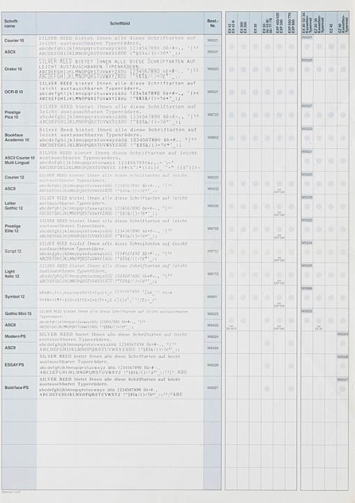 Schriftartenverzeichnis für elektronische Schreibmaschine, Textsysteme und Typenraddrucker Silver Reed Stand per 1.5.87