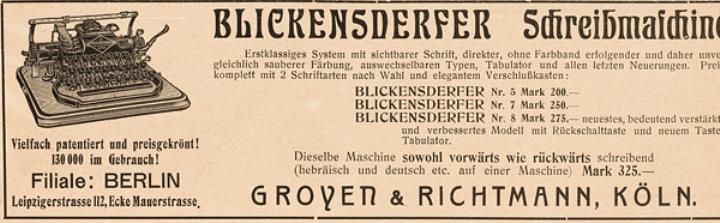 Werbeanzeige für Schreibmaschine Blickensderfer monochrom