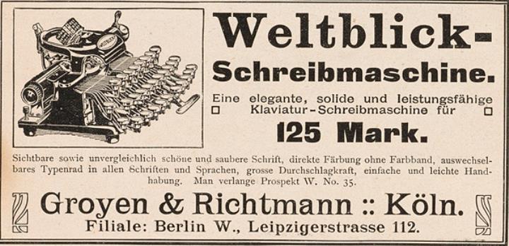 Werbeanzeige für Schreibmaschine Weltblick (Blickensderfer) monochrom, zwei Exemplare