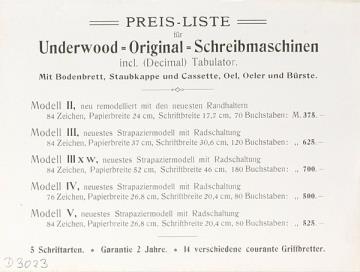 Preis-Liste für Underwood-Original-Schreibmaschinen