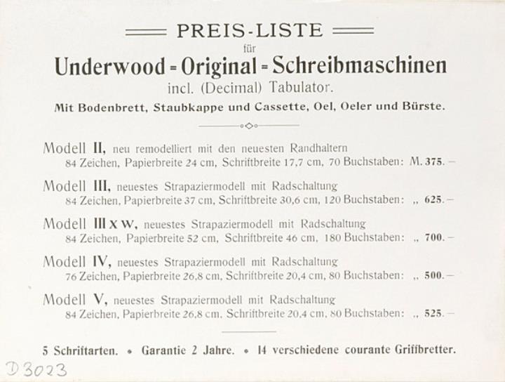 Preis-Liste für Underwood-Original-Schreibmaschinen