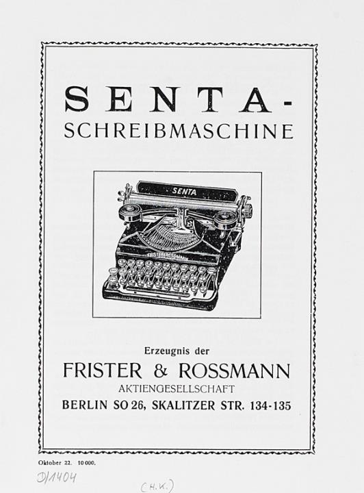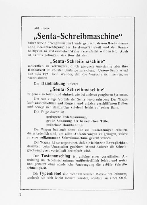 Prospekt für Schreibmaschine Senta Nr. Oktober 22. 10000 Nachdruck