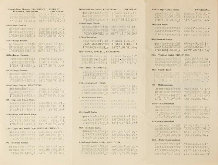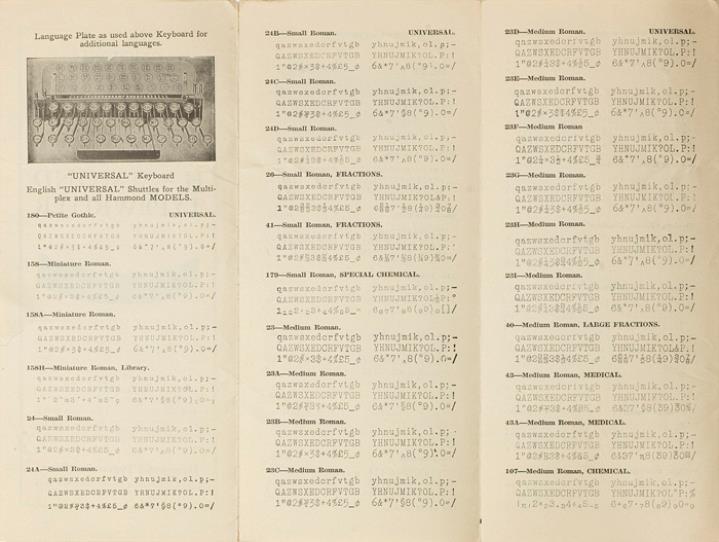 Faltprospekt zu Typenschiffchen/Schriftarten für Schreibmaschine Hammond Nr. QQ-5M-26-W.