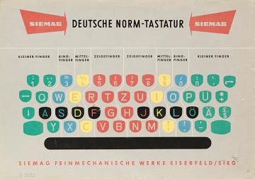 Tastaturansicht der Schreibmaschine Siemag mit farblich hervorgehobenem Zehnfingersystem